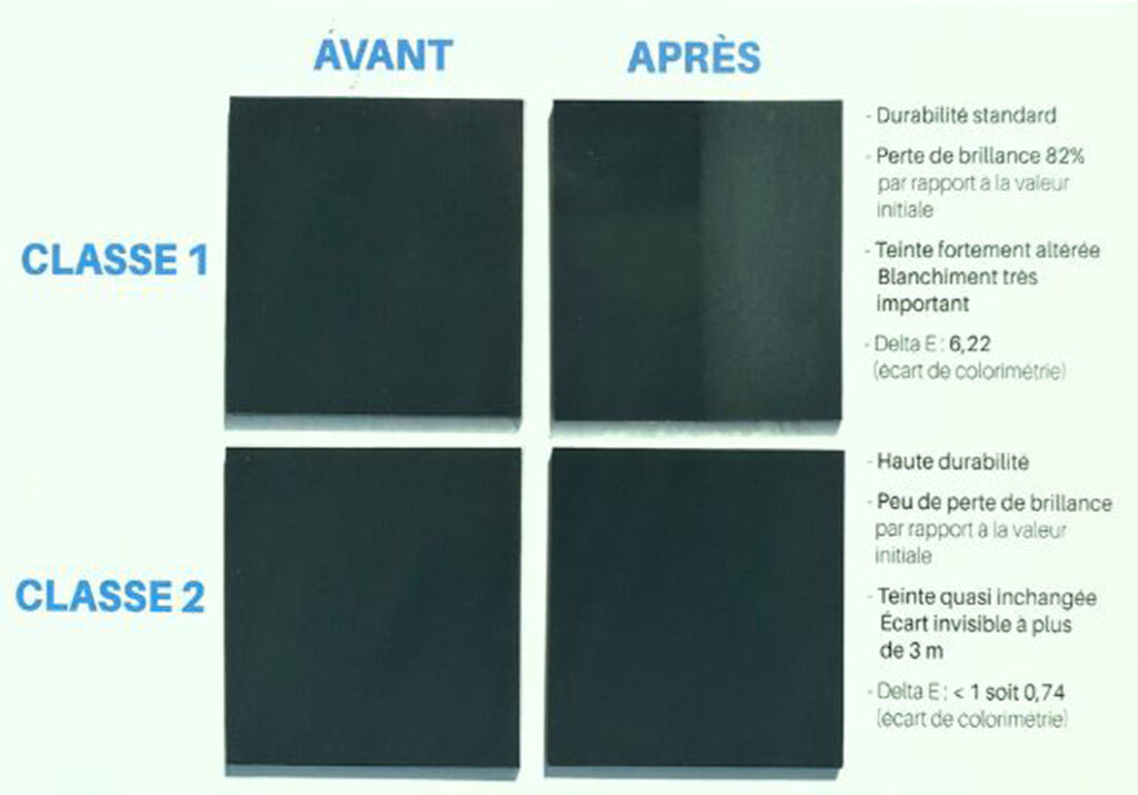 Pour preuve, le comparatif de vieillissement réalisé entre un laquage standard et l’autre de classe 2 après 600 heures d’exposition au test QUVB*. Un résultat sans appel : les menuiseries aluminium Qualicoat Classe 2 voient leur teinte presque inchangée, avec un écart invisible à plus de 3 mètres, contrairement au laquage de classe 1 qui affiche une teinte « passée ».
