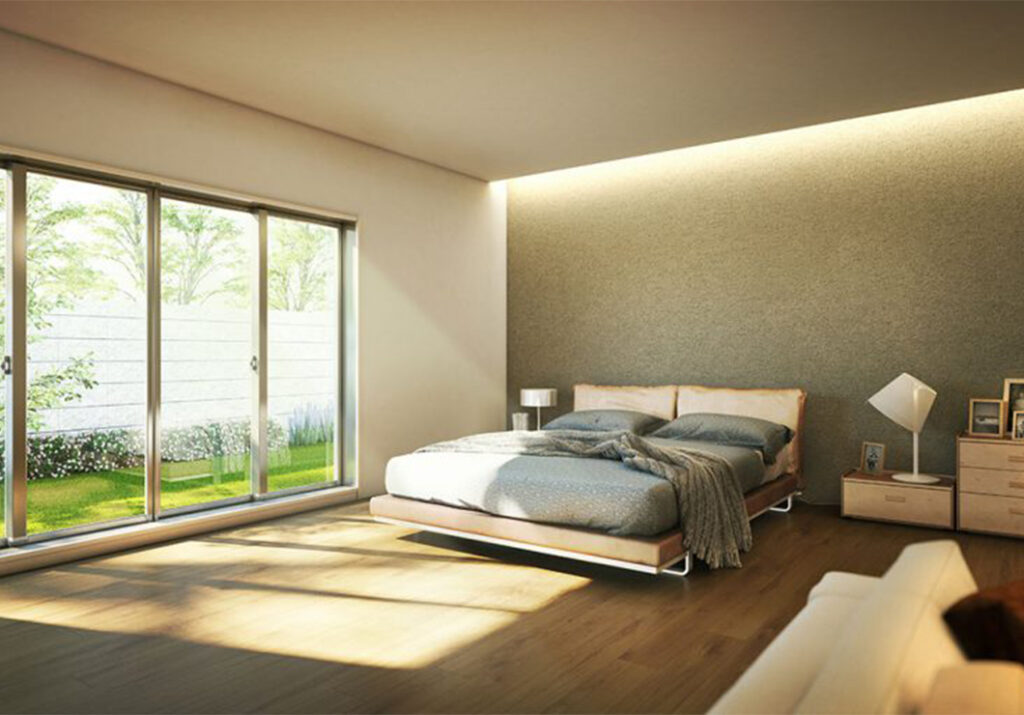 Se réveiller les pieds dans l’herbe ? C’est le charme qu’offre cette chambre ouverte sur le jardin grâce à un grand coulissant quatre vantaux. En plus d’apporter une touche de verdure à la chambre à coucher, il crée une ambiance chaleureuse en baignant l’espace de lumière naturelle.