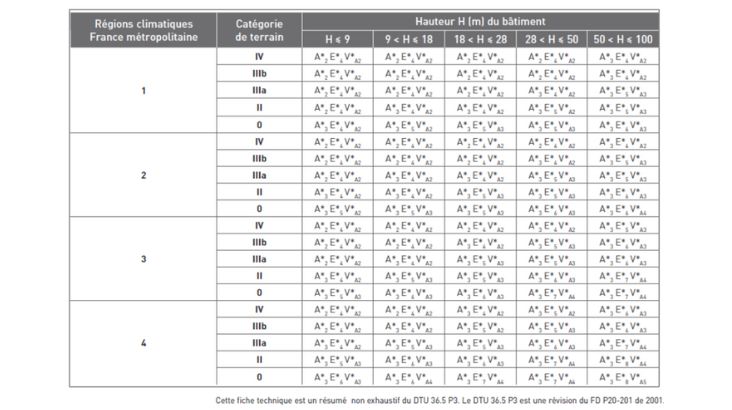 • consulter le tableau de classement AEV. Ce dernier indique le niveau de performance requis en termes d’étanchéité à l’air, à l’eau et à la résistance au vent.