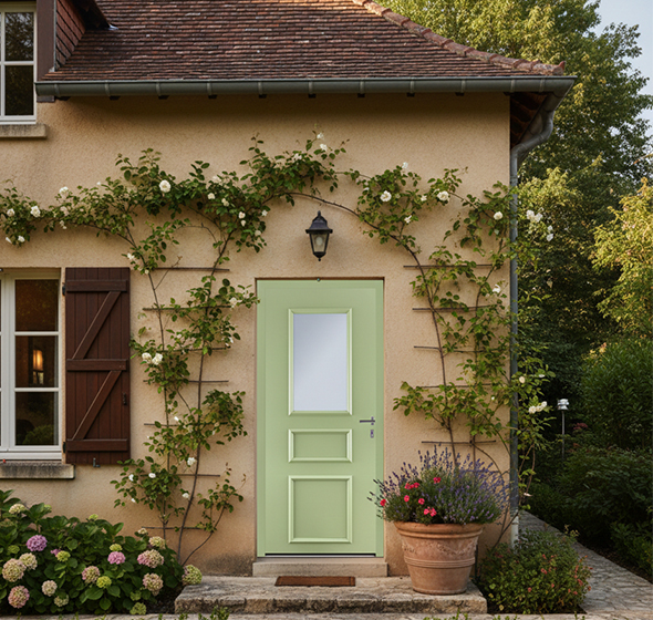 Une porte traditionnelle évoque le charme, l’authenticité et le respect de l’histoire du bâti. Elle accompagne les maisons de caractère et souligne leur identité, sans les dénaturer.