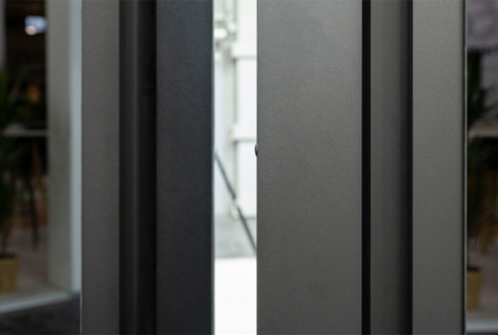 Toutefois, la palme de l’effet « whaou ! » revient sans nul doute à cette porte d’entrée Black Mirror réalisée en version XXL avec une hauteur hors norme ! Dotée d’une fermeture par gâche électrique, d’un seuil anodisé et de deux pans de vitres noirs miroir, impossible pour les visiteurs du salon de rester indifférents !